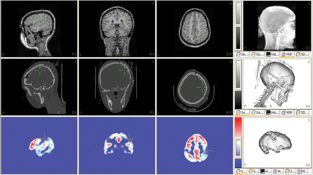 Largely improved co-registration accuracy can be achieved by this parameter-free, automated procedure. After setting the principal landmarks (Nasion and Pre-Auricular Points) in the first image modality (normally MRI), the algorithm is able to automatically co-register e.g. CT and / or PET images to this 'master' image dataset by optimizing the alignment by statistically analyzing the gray-level of all image data voxels.