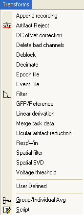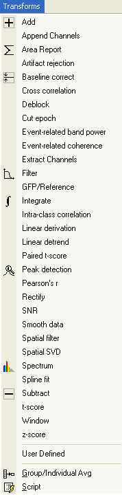 The following list contains brief descriptions of the Transforms that are included with the SCAN Analysis software. The file extensions in parentheses indicate which type(s) of data files can be used with each transform (CNT refers to continuous data files; EEG refers to epoched data files; AVG refers to averaged data files).