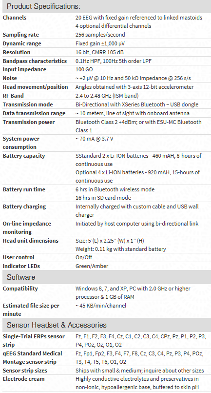 20 channels of high-quality EEG, plus 4 optional channel for ECG, EMG, or EOG (24 Channels @ 256Hz)
