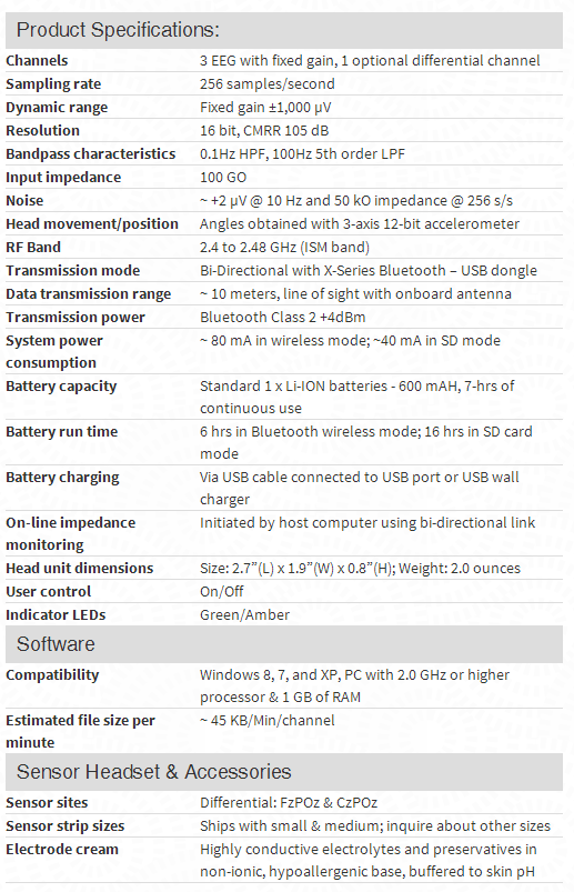3 channels of high-quality EEG, plus 1 optional channel for ECG, EMG, or EOG (4 Channels @ 256Hz)