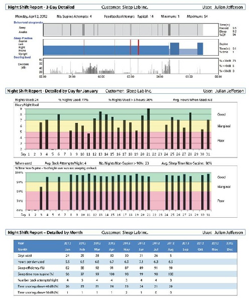 Night Shift uses vibrotactile feedback to discourage supine sleep and treat mild to moderate sleep apnea. Supine feedback is initiated only after the patient falls asleep; the frequency and intensity of feedback adapts to meet the requirements of each user.